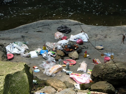 A hastily abandoned picnic site, with food still sitting halfway done on the BBQ. This appears to be the picnic of the drowning victim. Note the beer cans. Alcohol and water do not mix.